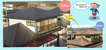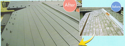 | 断熱材入りで上張り可能の横暖ルーフ屋根 | *現在、よくある安価な上からカバーするガルバリウム金属屋根瓦のタイプは、へこみやすい為、お勧めしません。 | |||||