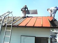 | 下地防水紙を残し屋根を撤去 | 12mmベニヤの張替え | ルーフィング防水紙敷きこみ | コロニアル屋根を張ります | ||